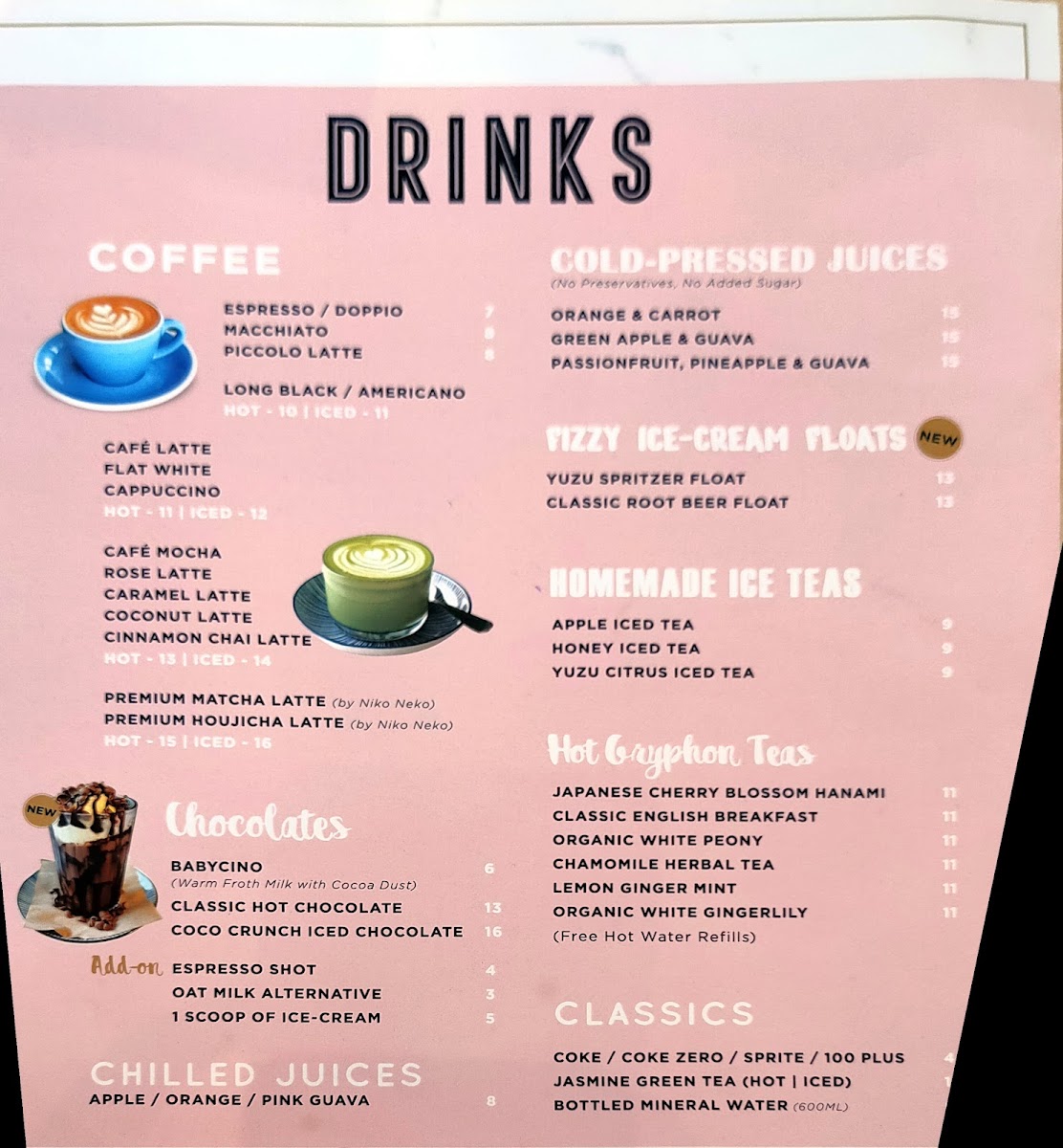 - Coffee and Tea: A variety of coffee drinks like Coffee Latte, Flat White, Cappuccino, Cafe Latte, Matcha Latte, and Babychinno, as well as jasmine tea.